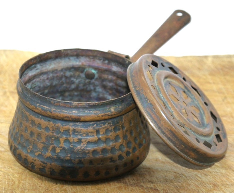 Antique copper bed warmer from the 1950s-60s, handcrafted and in excellent condition.