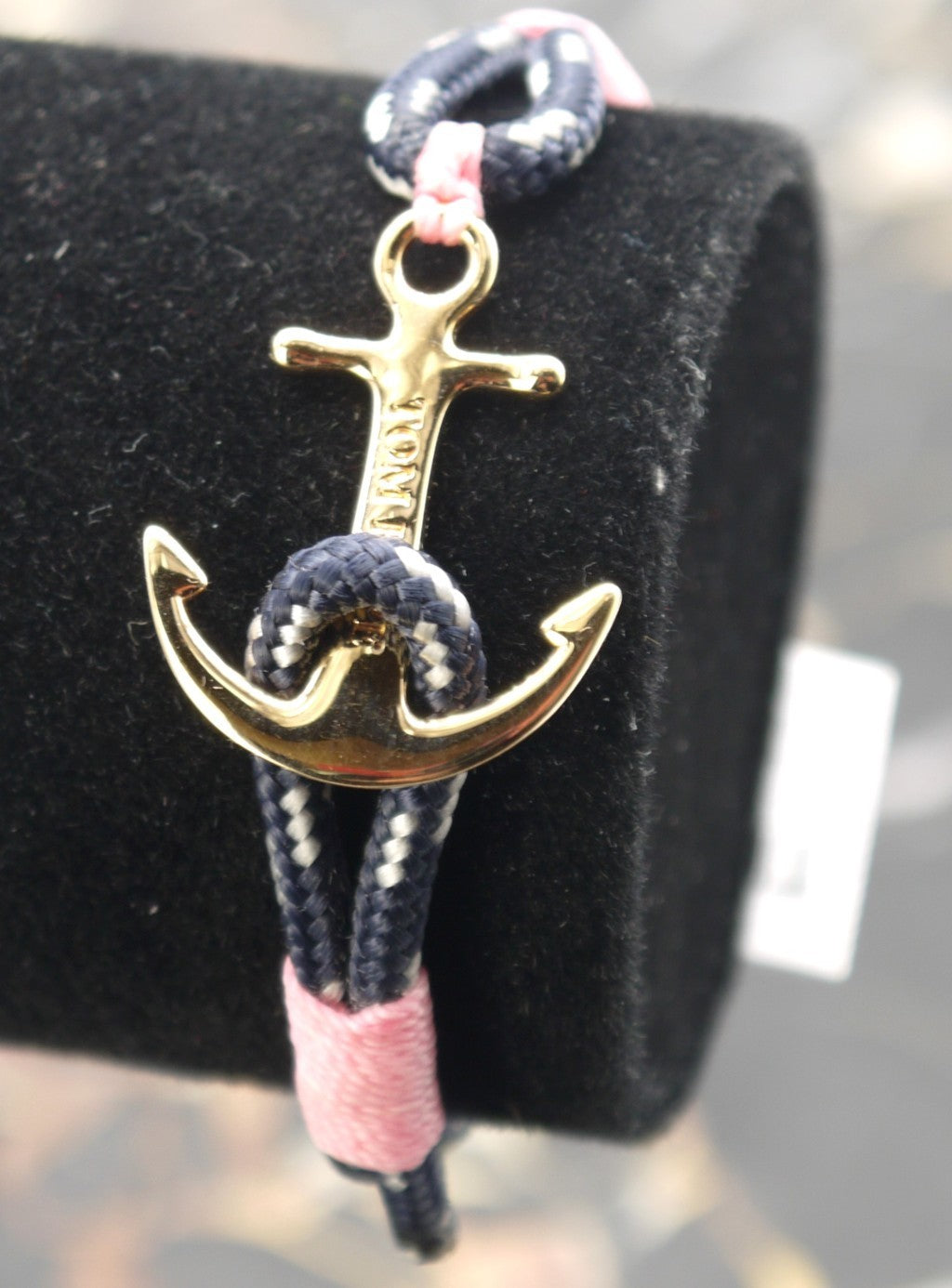 Featuring our rose gold-plated anchor, blue braided cord, white accents and pink clasp