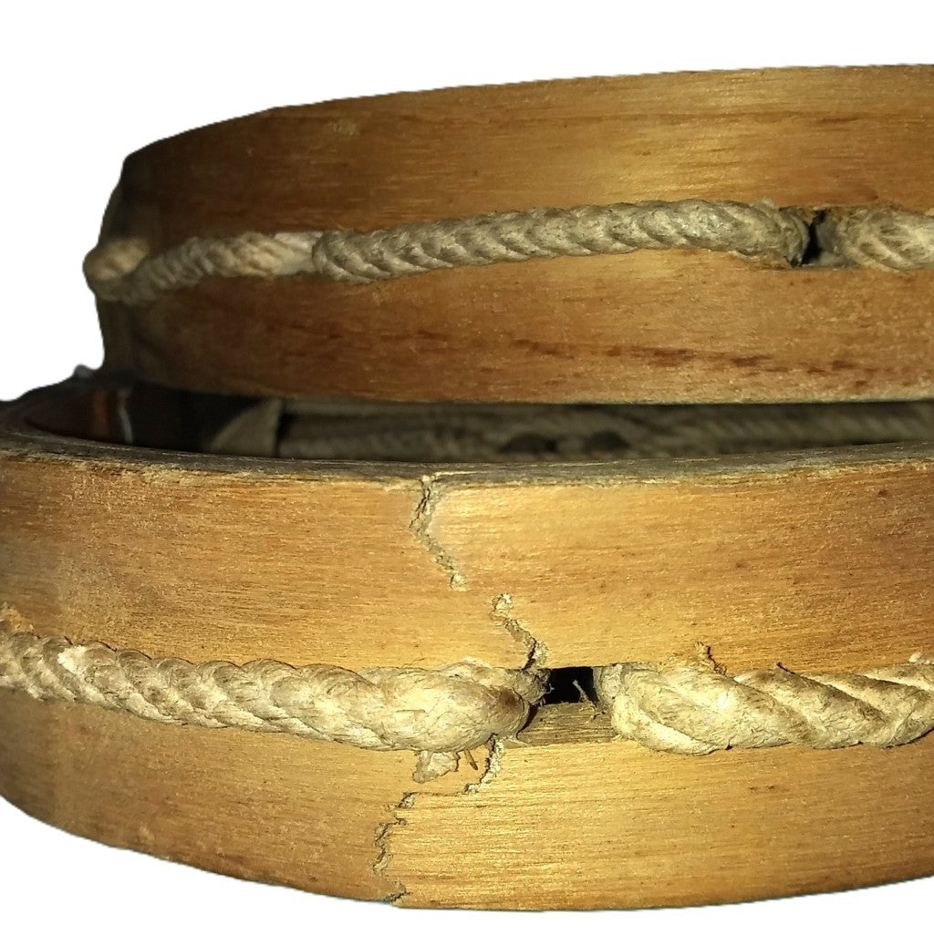 Sur la pointe et le talon d'une raquette à neige, après des années de tension sur la corde, deux fissures se sont formées dans le bois (photo).